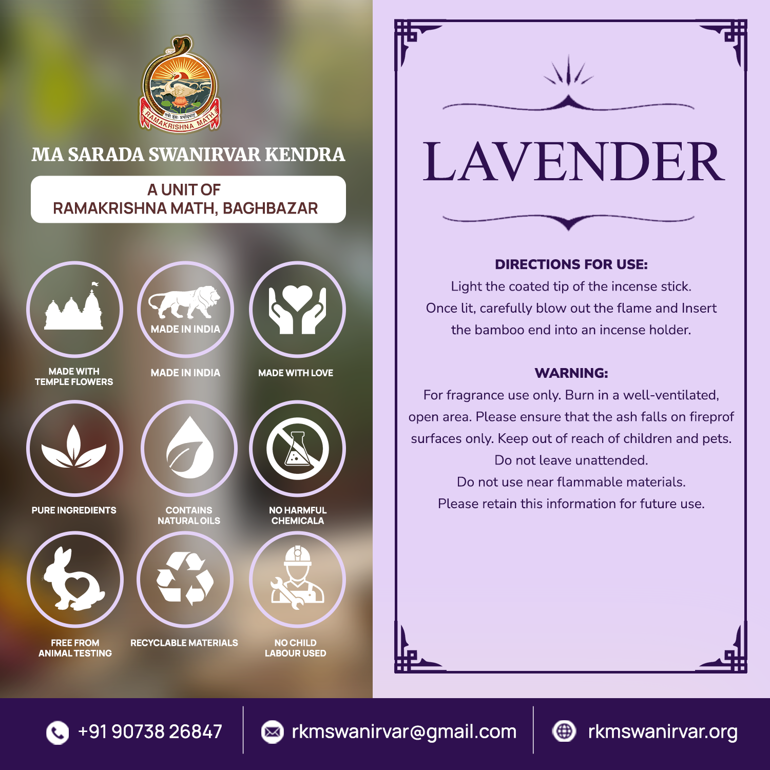 - Ramakrishna Math (MSSK) Organic Incense Stick (Herbal) is the perfect solution for creating a tranquil atmosphere. It is premium quality, long-lasting, made with natural ingredients, eco-friendly, easy to use, and perfect for gifting. Made in India, MSSK Organic Incense Stick ensures the highest quality and durability. Its unique blend of herbal and lavender scents provides a long-lasting fragrance and guarantees a serene environment. The sustainable materials used in Ramakrishna Math (MSSK) Organic Incense Stick offer a clean burn, making it suitable for both indoor and outdoor use and perfect for those who appreciate eco-friendly products. Our incense sticks are simple to light and maintain, designed to enhance meditation sessions and promote relaxation. Ramakrishna Math (MSSK) Organic Incense Stick measures 10 inches and is suitable for all ages. Available in a calming lavender scent. Ideal for home, office, spa, and yoga studios,
